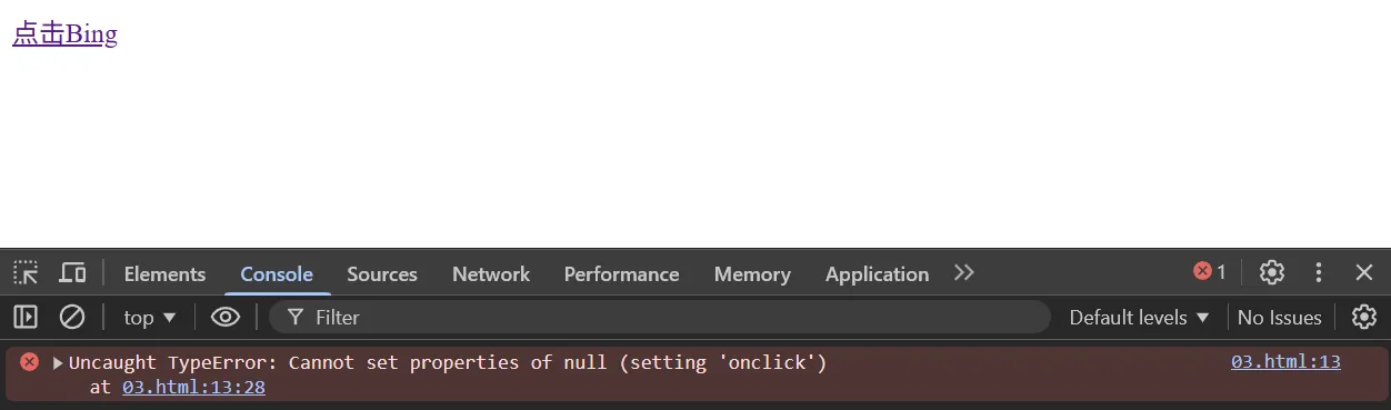 <script> var bingElement = document.querySelector('.bing') bingElement.onclick=function(){ alert('Bing一下') } </script>