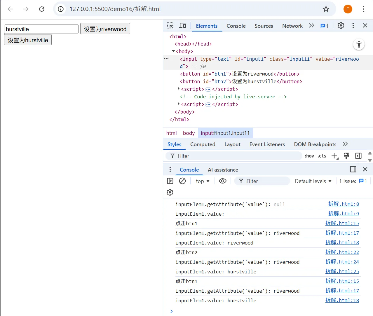 btn1.onclick = function () { console.log('点击btn1') inputElem1.setAttribute('value', 'riverwood') console.log("inputElem1.getAttribute('value'):", inputElem1.getAttribute('value')) console.log('inputElem1.value:', inputElem1.value) }